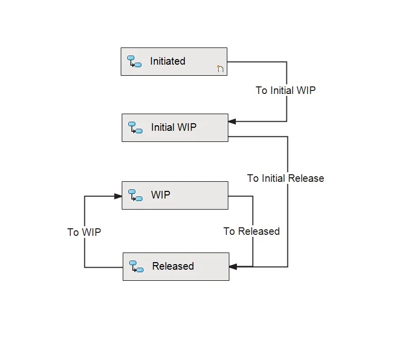 Similarly, the “To Initial Release” transition has a condition where the file must have the revised checkbox equal to 0 to satisfy transition.