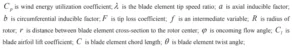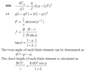 To achieve this in today’s high-performance turbine/propeller designs, we have adopted use of Blade Element & Moment Theory. This “2D” approach allows me to optimize the span wise 3D shape by dividing the blade into smaller sections, or elements along the span of the airfoil. Chord Length (C), and twist (Angle of Attack or Alpha), are in turn calculated at each element or section. This is then transposed to be used in calculating the energy efficiency coefficient for that particular element. This can be accomplished in many programs, such as matlab, etc. See below Figures 1&2: Mathematical Modeling & Explanation of Terms.