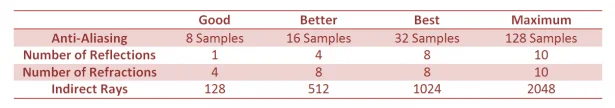 PHOTOVIEW 360 gives you four different pre-set options for the final render quality of the image; these are ‘Good’, ‘Better’, ‘Best’ and ‘Maximum’. But, what’s the difference, and what do they actually mean in our renders? Firstly, we need to look at what parameters are being set by each of these pre-sets: