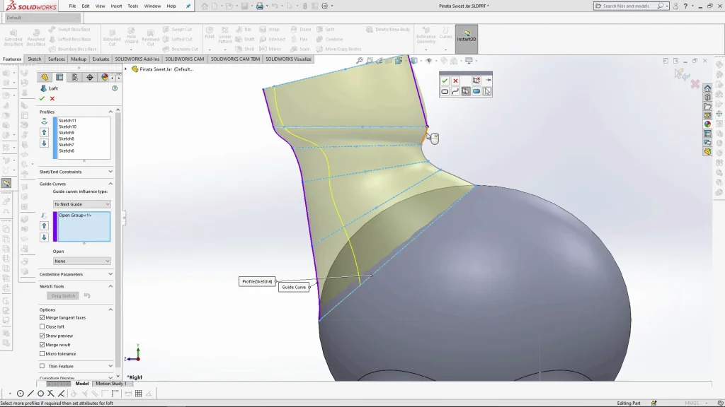 In part 1 of this 2-part SOLIDWORKS Tutorial you will learn how to create the body of a Pinata. This involves the use of DXF files, lofts with guides, boundary boss, move/copy bodies and the combine tool. Part 2 of the tutorial involves shelling the model to turn it into a 2-part jar, and applying decals. The DXF file used in this tutorial is available to download here.. By the end of part 1 of the tutorial you will have the main body of the Pinata created ready for part 2.