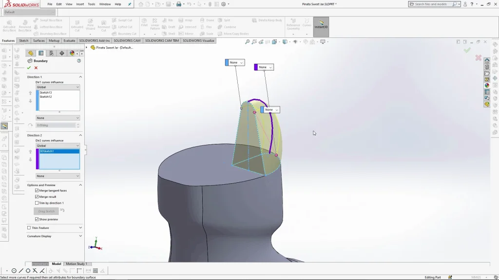 Boundary boss was used to create the Pinatas ears, and again a guide curve was used created with a 3D sketch to inform the boundary on what path to follow joining the two faces. The boundary boss can be very useful joining up two touching sketch profiles along a guide.