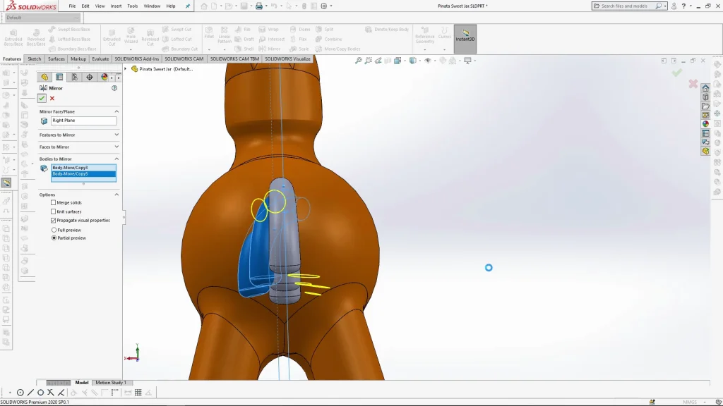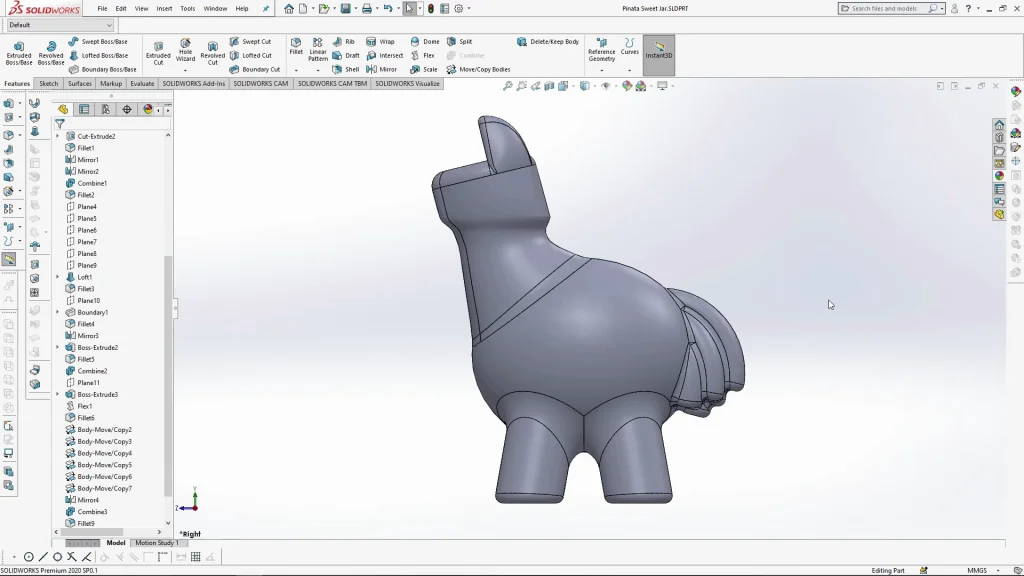 The tail copies were combined to the Pinata body to become one body, all edges and joins were filleted. With the Pinata complete, watch Part 2 to see how the jar is shelled, the lid fixture is formed, and decals are applied.