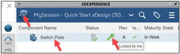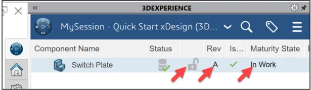 View the Status column in the updated MySession panel. The Status icon displays a green check mark. This means that the current file on your SOLIDWORKS desktop is updated and saved to the platform. The default Revision is A. The Maturity State is “In Work”. This is the default Lifecycle state after you saved the model to the 3DEXPERIENCE platform.