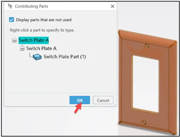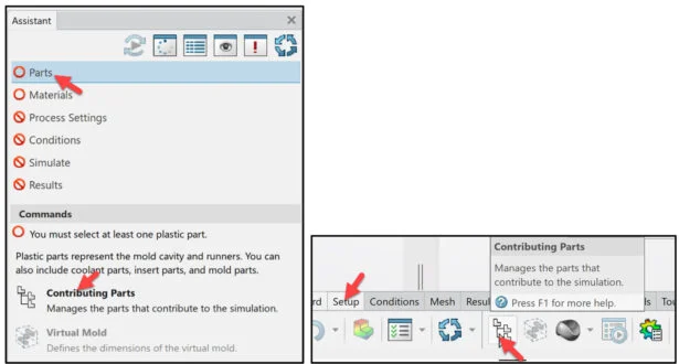 Click Contributing Parts from the Commands box. Note: You can also click Contributing Parts from the Setup tab in the Action bar.