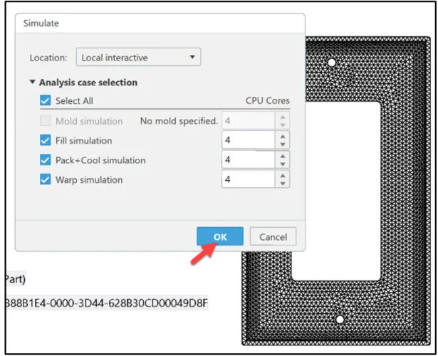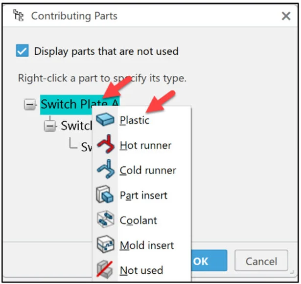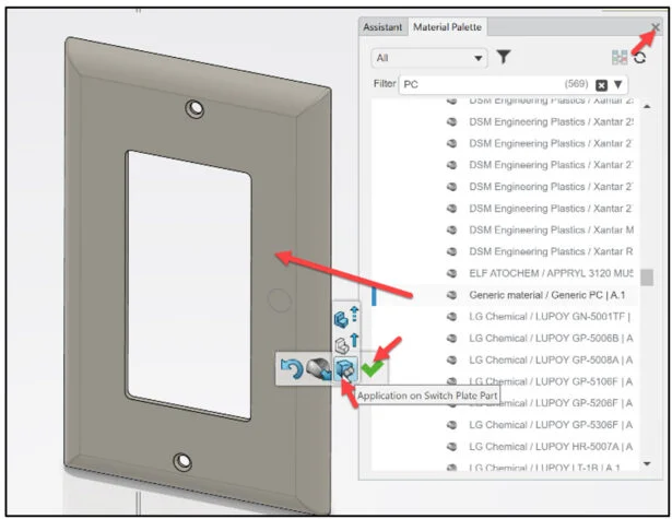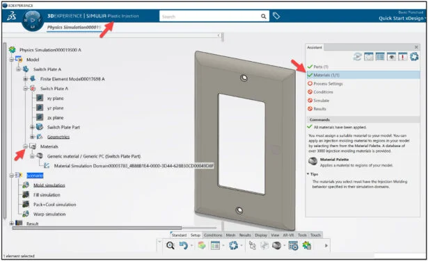 Add material to the Switch Plate. Apply Polycarbonate. The material you select must have the Injection molding behavior specified in their simulation domains.