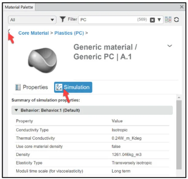 Select Generic material / Generic PC | A.1. View the Simulation material properties.