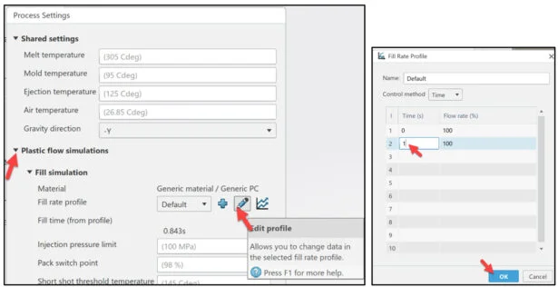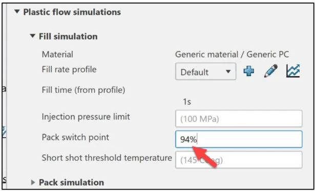 Define the process settings. Modify the Fill Rate Profile and Pack Switch point.