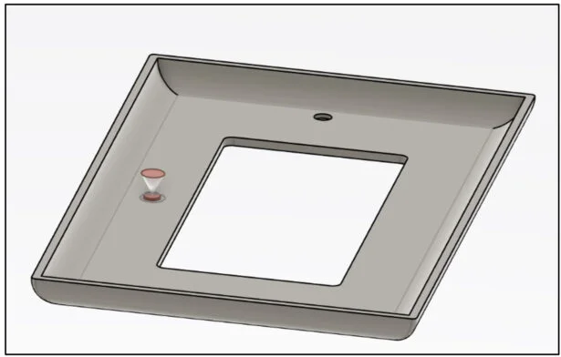 Open the Switch Plate part that has not been previously uploaded or saved to the 3DEXPERIENCE platform. Do not run Feature recognition. The Switch Plate is displayed in a back view. View the position of the Injection point.