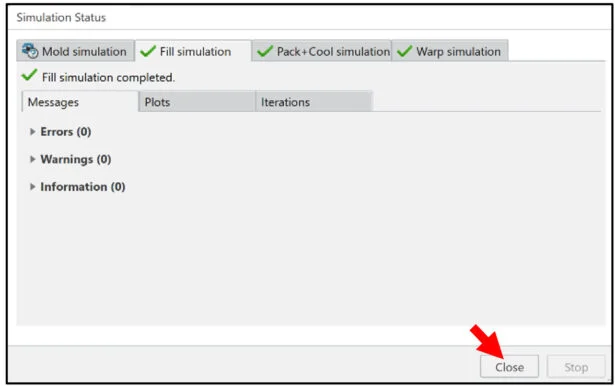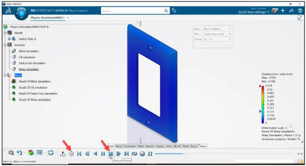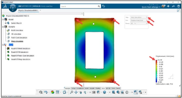 View the created simulations: Fill, Pack + Cool and Warp. Analyze various simulation contour plots. Create an animation of the Warp Simulation – Total Displacement contour plot. Save the study. Close the study.