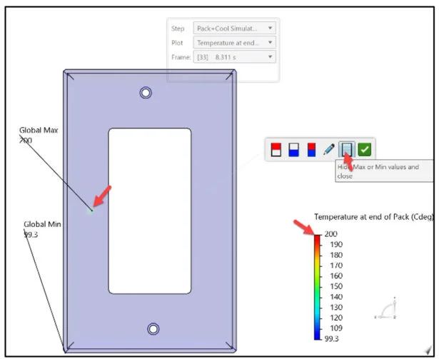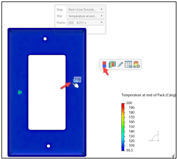 Click a point on the model as illustrated. The mouse cursor automatically acts as a probe. View the temperature at that point. A Pop-up menu is displayed.