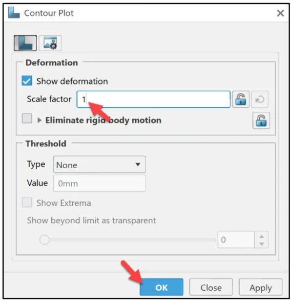 Edit the deformation scale of the displacement plot to view the deformed shape of the Switch Plate in true scale.