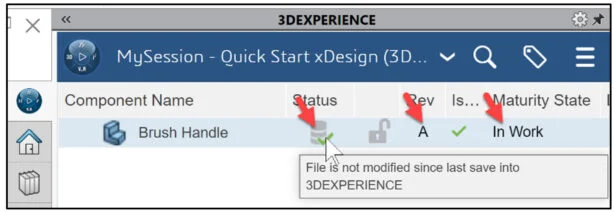 View the Status column in the updated MySession panel. The Status icon displays a green check mark. This means that the current file on your SOLIDWORKS desktop is updated and saved to the platform. The default Revision is A. The Maturity State is “In Work”. This is the default Lifecycle state after you saved the model to the 3DEXPERIENCE platform.