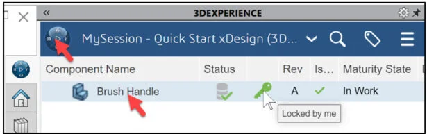 Expand the Task Pane bar. The MySession panel displays the Components Name, Status (Displays an icon that represents the status of a given revision, save or not saved to the platform), Locked status (Locked or Unlocked), Rev (Revision #), Is Last Revision (Yes/No), Maturity State (Lifecycle state of the family, for example: Private, In Work, Frozen, Released, Obsolete), Description, File Name (Displays the PLM external ID of the object for reference objects and the PLM external ID of the connection for instances) and Type (Physical Product or Drawing).