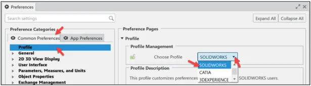 Select a Profile from the Profile Management drop-down menu (SOLIDWORKS).