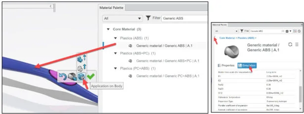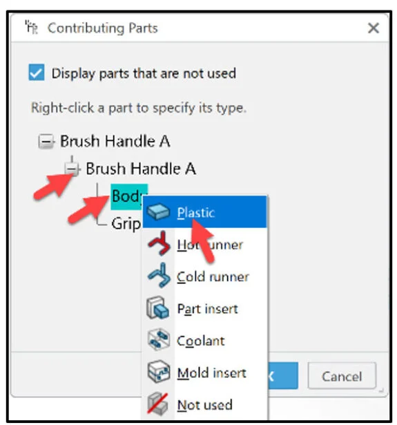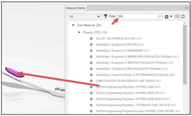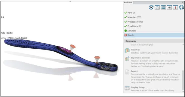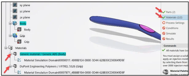 Apply Generic ABS material to the Body. Apply DuPont Engineering Polymers / HYTREL ® 5526 material to the Grip. The materials you select must have the Injection molding behavior specified in their simulation domains.