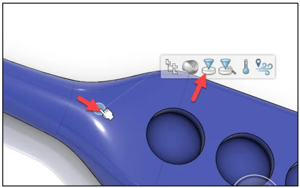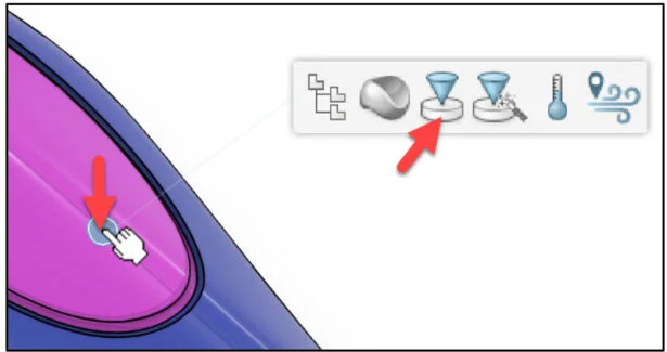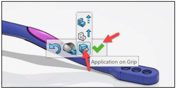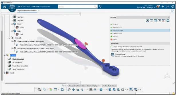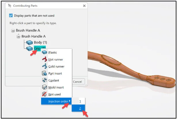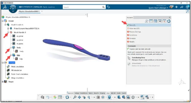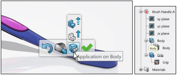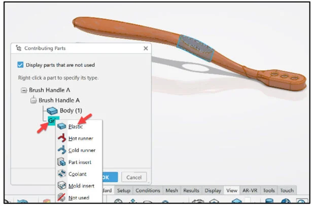 Open the Brush Handle part that has not been previously uploaded or saved to the 3DEXPERIENCE platform. Do not run Feature recognition. View the two Injection points (Body and Grip).