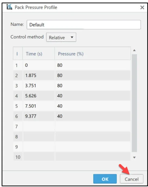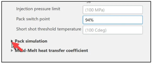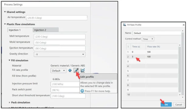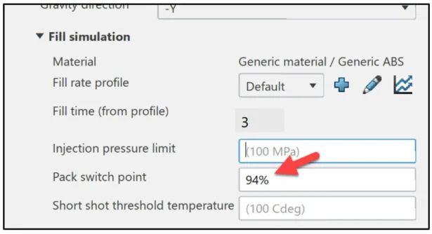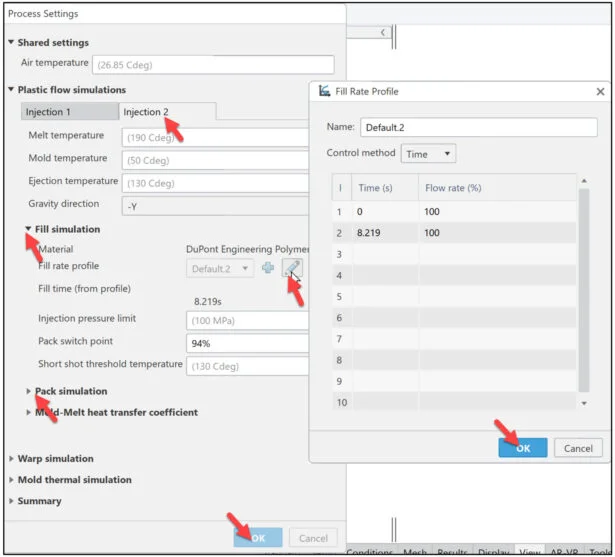 Define the process settings. Modify the injection fill rate and pack switch point.