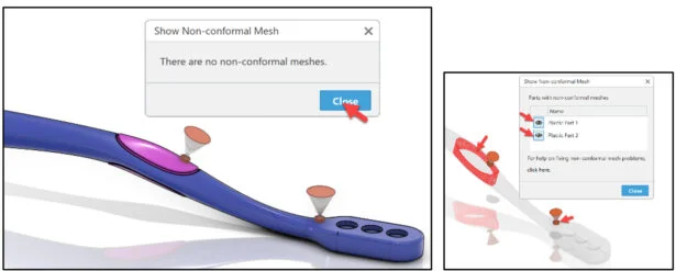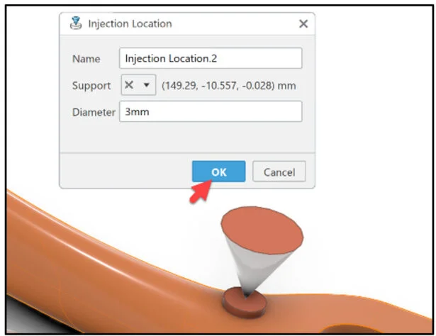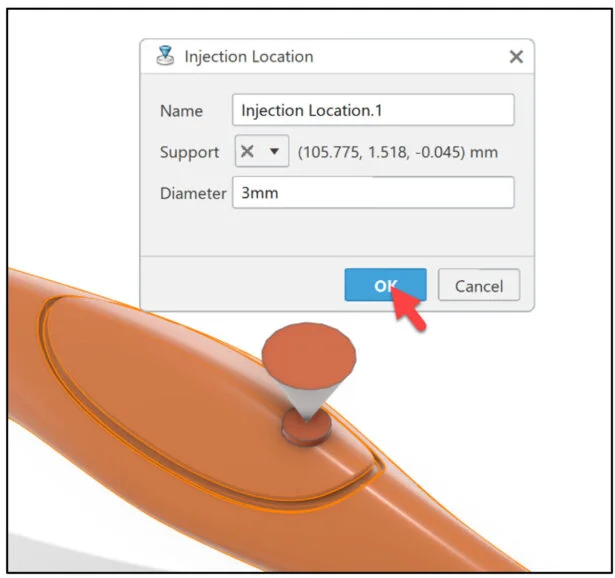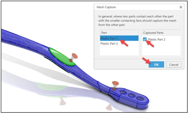 Define the injection point on Body and Grip. Define the mesh capture order to facilitate the creation of the conformal mesh between the Body and Grip.