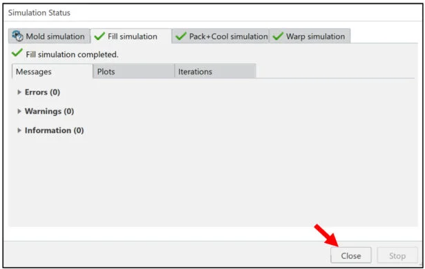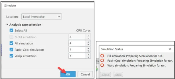 The Simulation Status dialog box is displayed. View the created simulations: Fill, Pack + Cool and Warp.