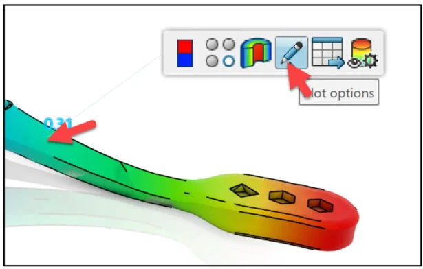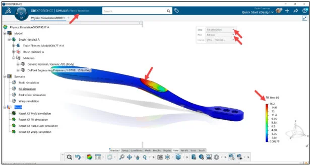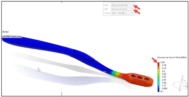 Review the pressure at the end of Pack analysis case. View the results in the Graphics window. The default contour plot is Fill time. The Fill time pot displays the time when the plastic flow front reaches each point in the model. The portion of the Brush Handle that is filled with plastic last is the end of the grip that is furthest from the grip’s injection.