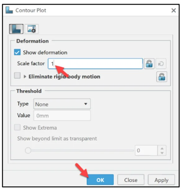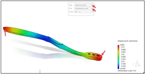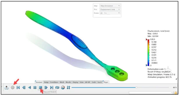Create an animation of the Warp Simulation – Total Displacement contour plot. Save the study. Close the study.