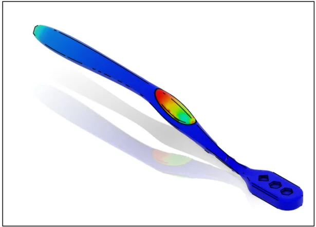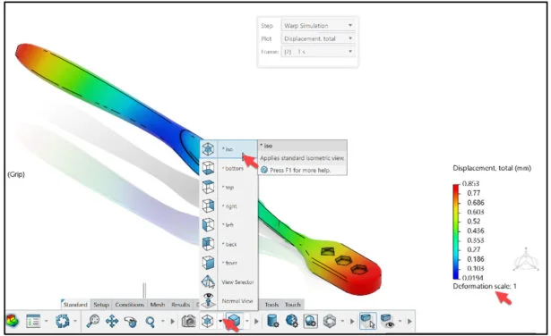 Edit the deformation scale of the displacement plot to view the deformed shape of the Brush Handle in true scale.