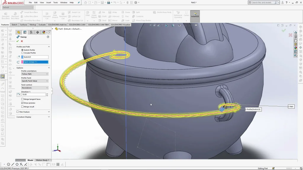 The sweep feature is created with new planes, guide sketches and a profile that mimics several wires. The sweep profiles is then twisted along the path to create a twisted wire handle that loops into the pots ears. The face ends of the sweep are then domed by un-ticking the continuous dome box to neatly close off the handle on both ends.