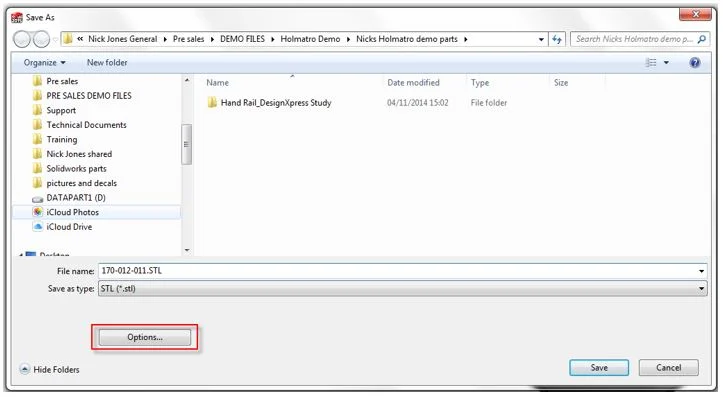 In the save as window, once you’ve selected .stl as the save as type, an options box will become available. Click options to adjust the settings