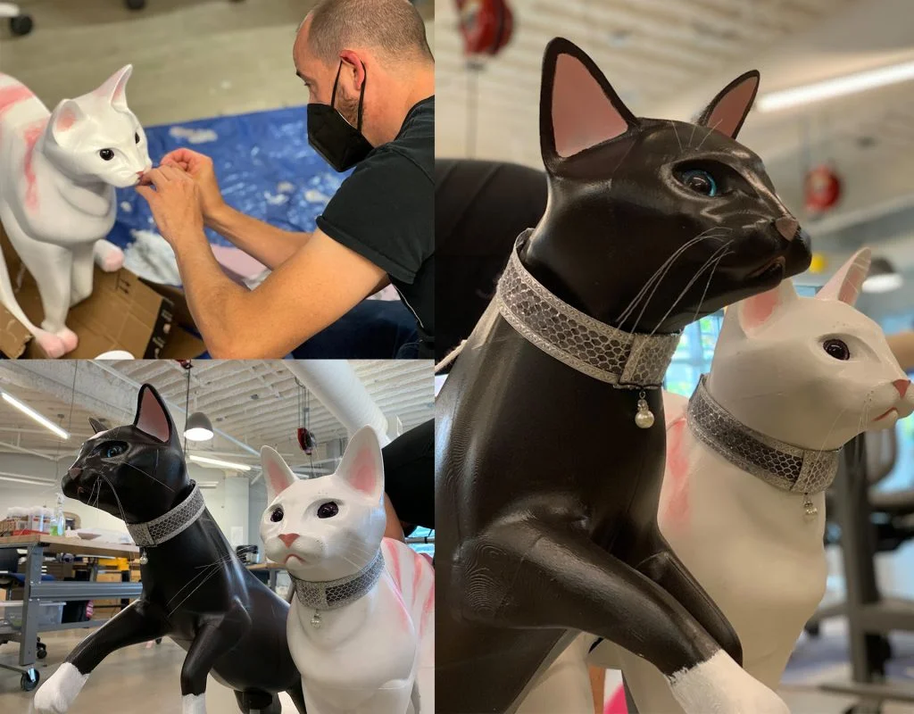 With the cat logistics figured out, there was one more thing to do to bring them to life: paint them. Rob is super confident in his skills as a designer, but not so much as a painter. He didn’t want to mess the cats up, so Meaghan Murphy and Vincent Liu joined the team as the resident painters. As cat lovers themselves, they had a ball painting the cats contrasting colors. One cat looked like a black and white tuxedo cat, similar to Freyja’s cat, and the other one was made more fantastical: white with fuchsia tiger stripes going down the back.