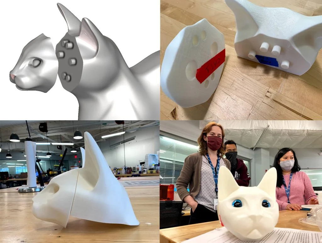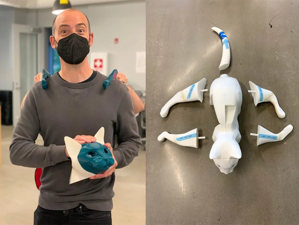 3D printing allowed for more precise real-world cats. The pieces matched Rob’s designs to a T, and he put everyone’s printers to work. In the two weeks it took to 3D print all the cat parts, Rob utilized all of the available 3D printers in the 3DEXPERIENCE Lab, along with Annie Cheung, Gabe Enright, and Sal Lama’s personal 3D printers in their homes. When each piece finished printing, Rob took them and glued them together. Once they were glued, he barely had to do any post-processing—just a little sanding and filling in cracks.