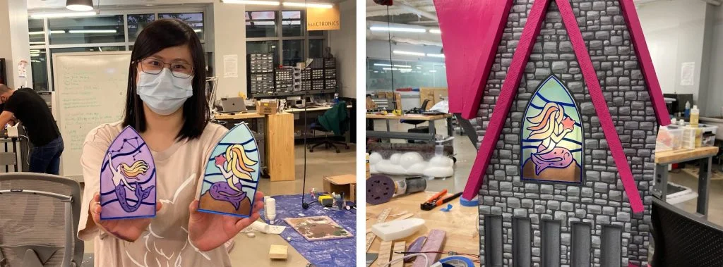Chinloo used her own vinyl cutter at home to cut out the “lead” lines of the stained glass. The lines’ thickness went through a number of iterations so the cutter could slice through the material. Once the lines were ready, Yun Li stuck them to pieces of acrylic. She used watercolor markers to paint the “stained glass.” The starfish window was painted with bright blues and daytime colors, while the constellation window was painted to look like dusk, with deep purples and pinks. The team placed LED lights behind the two windows so it looked like candlelight was flickering inside the castle, bringing the stained glass effect to life.