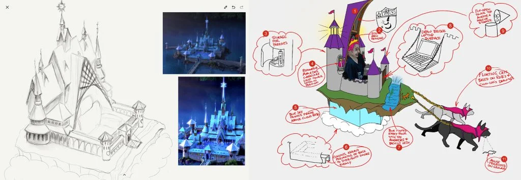 Sal jumped on the 3DEXPERIENCE platform and used 3D Sculptor to design the clouds and grounds for the castle. When the team gave him feedback and said the clouds looked a little flat, he went back and pushed and pulled the clouds—using Sub-D modeling, into their final rotund shape. For the grounds, Sal designed the basic shape with 3D Sculptor, and then David Law hand-carved the crags and texture into the final foam pieces.