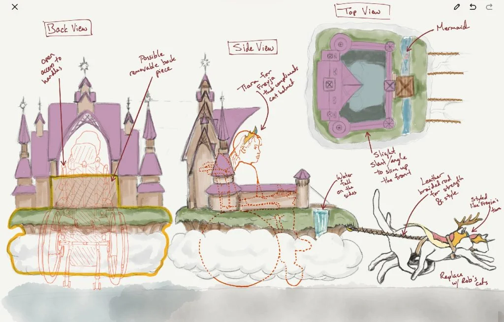 Freyja wanted her princess experience to be one-of-a-kind. Rather than dress as a princess from popular culture, she wanted to be the princess she knew she was inside of herself, but she did give the build team a ton of inspiration. Her favorite princess castle is from Disney’s Frozen. Freyja also wanted mermaids to be involved, and dragonflies, and stars, and rainbows, and the color pink, and cats, and much more. The breadth of her imagination and interests continually inspired the build team.