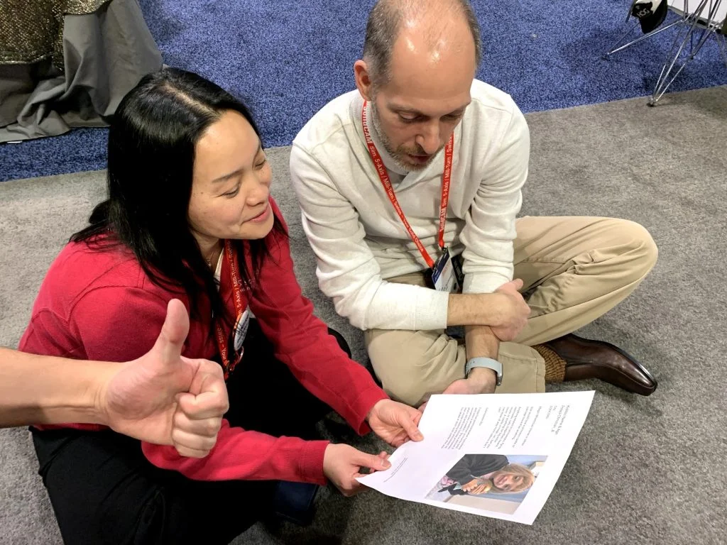Team leaders Chinloo and Sal Lama reading Freyja’s Magic Wheelchair profile at 3DEXPERIENCE World 2020