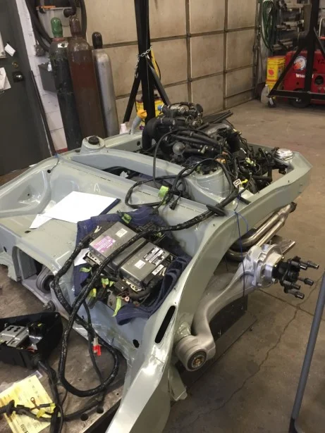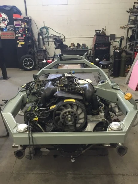 Although work on Tucker Torpedo slowed at Rob’s shop, work continued on at “Bobsled Bob” Cuneo’s Chassis Dynamics shop. Bob continued to work on the chassis and now has it completed. You would never know the chassis started out as a complete Porsche 964! The only thing left of the original Porsche is the drivetrain and rear tub as you can see in the pictures below. The rest was completely fabricated by Bob.