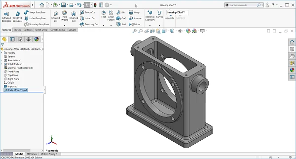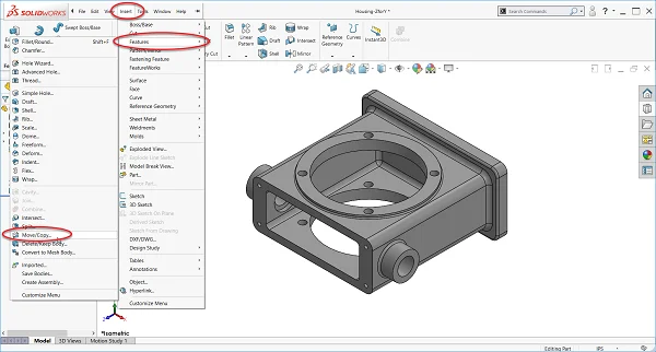 In the example provided next, the part is not oriented the way we’d like it to be in SOLIDWORKS. To fix this, go to Insert, Features, Move/Copy.