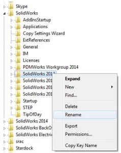 It is always advisable not to make permanent changes to the registry without first checking that they will not damage your system. As such, at this point you can right-click the folder that represents the version of SOLIDWORKS that you want to reset (in this case 2012), and select to Rename the folder.