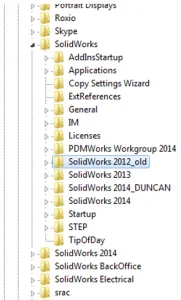 Within the Software folder, scroll down to find the folder called ‘SolidWorks’ and expand it. This folder contains multiple folders that control different aspects of SOLIDWORKS on your machine. There are separate folders listed here for each different version of SOLIDWORKS that is installed on the machine. In the imager to the right, you may see that I have multiple versions (2012,2013, and 2014).