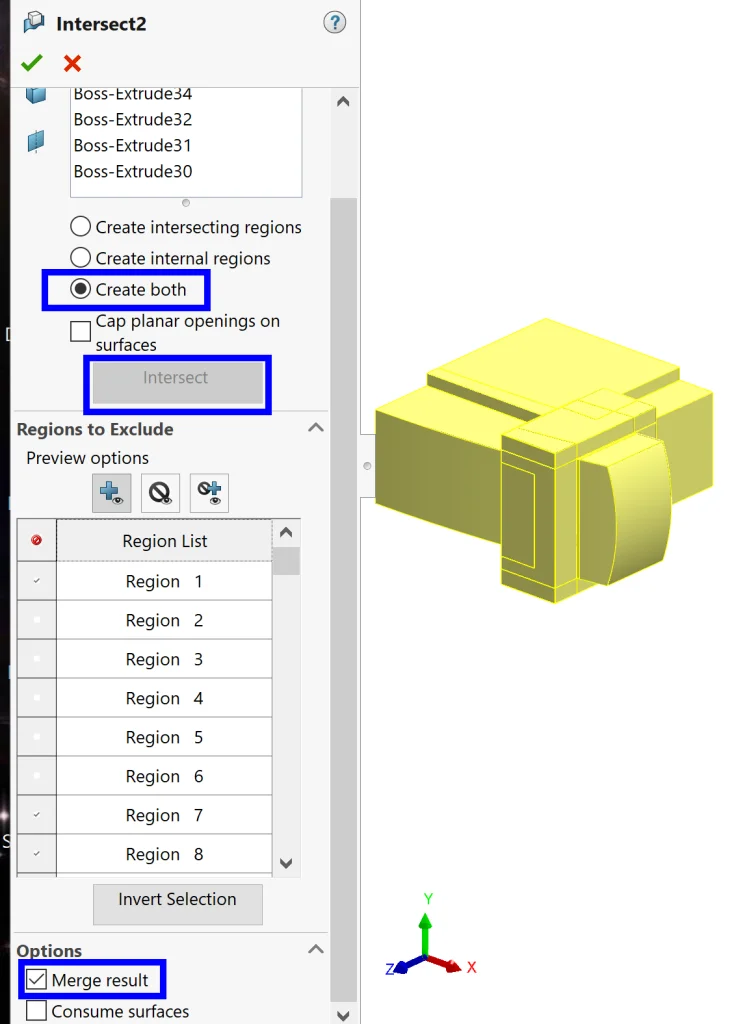 Now it is time to activate the magical Intersect command. After activating the command, we want to select all of the bodies we just created and click the Intersect button after selecting Create both in the properties box. Then we can start clicking in the graphics area to remove excess material. I find this to be the simplest way of getting exactly what I want, especially with a large number of bodies, but we could have also checked and unchecked boxes in the Regions to Exclude area of the properties box. Once we have exactly what we want, we can select Merge result and hit ok.