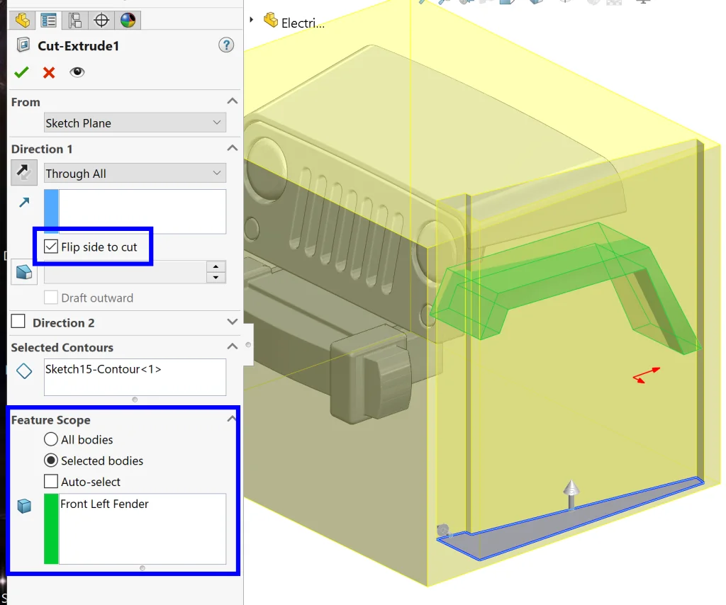 From here, I traced the profile from the TOP, and cut away the excess material using a Cut-Extrude by selecting Flip side to cut in the command and selecting the body we just created under Feature Scope.