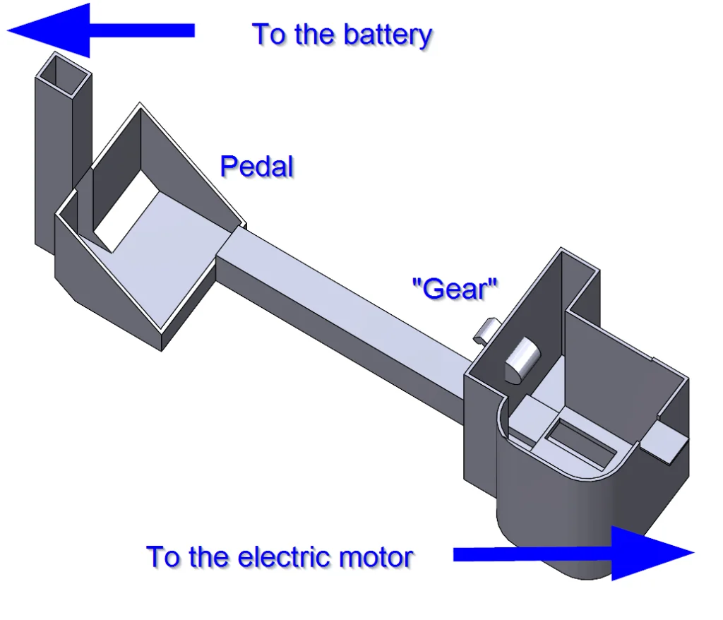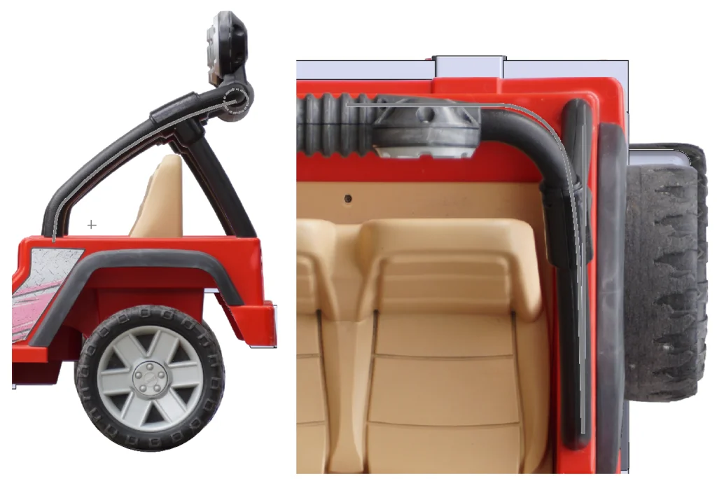Fairly straightforward so far, right? Next, I added what I’m called the “underbelly” – again using the partial information we get from the side view – before moving on to the pedal and the area that houses the electronics from this and connects to the battery area in the front. The rest of the conduit was fairly simple after going back and forth, but I do want to mention one place that I made a mistake the first time using the Shell command. Essentially my technique was to Extrude the conduit and then Shell it out to create a path for our wires, but the timing of the Shell matters. Make sure you can visualize the end product before hollowing it out because you might want to combine multiple bodies before activating this command. Here’s what most of our conduit looks like in isolation and then in the context of our whole vehicle.