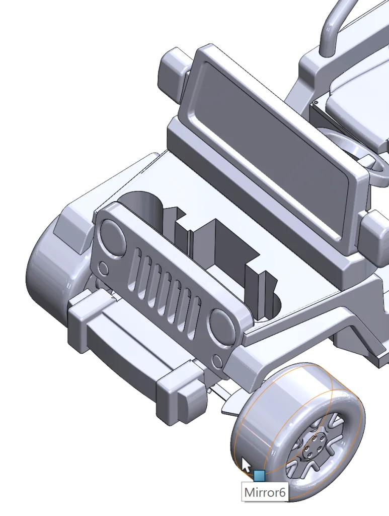 Now we can start getting a bit more specific. The seats and the window’s glass are separate bodies, so we can apply an appearance at this level. The same thing goes for most of the grill, so we can apply an appearance and get more specific with the lights and turn signals later.