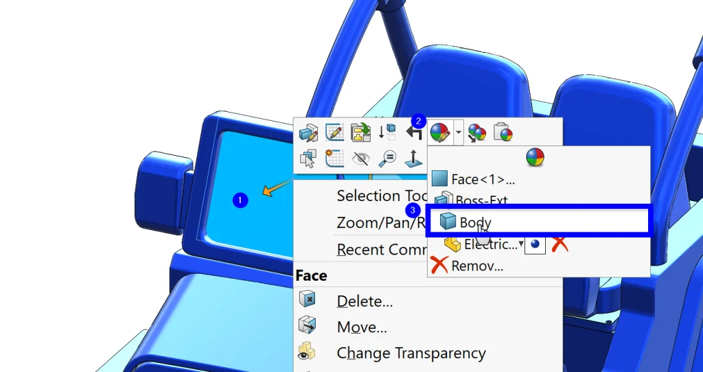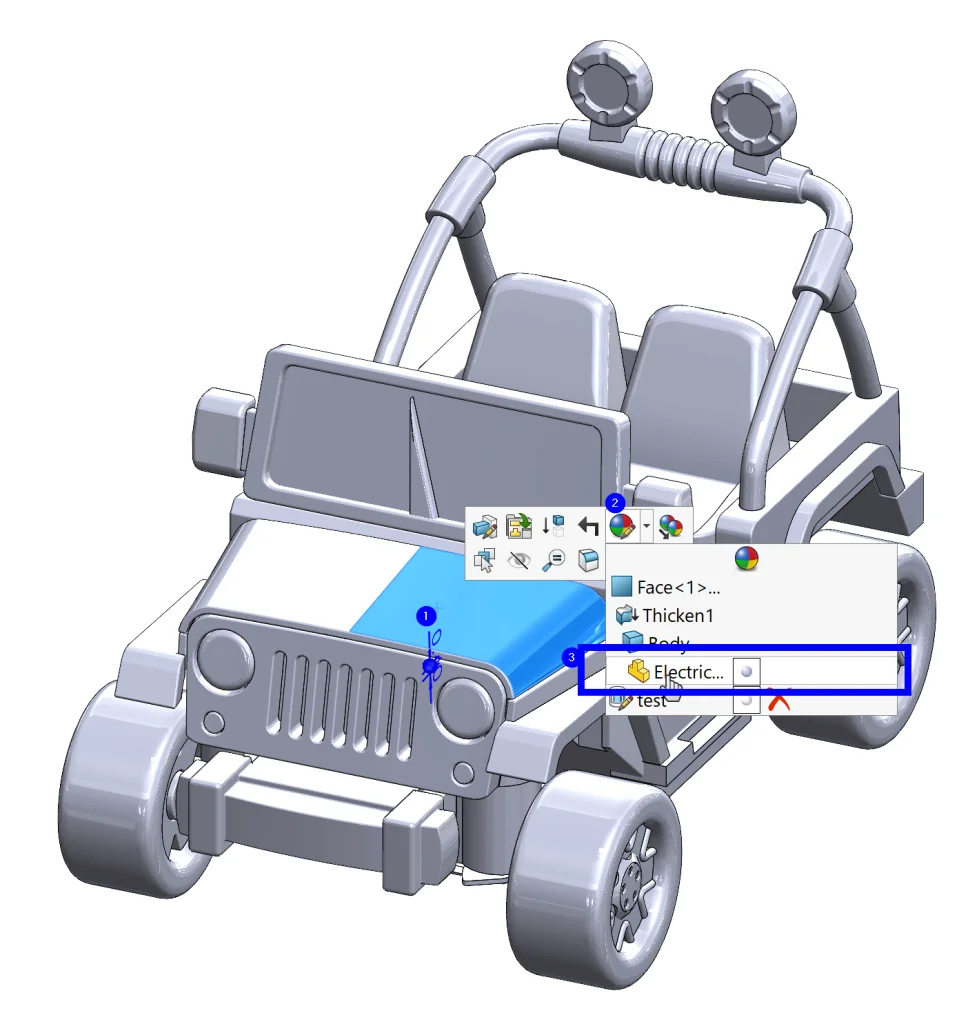 There are so many different ways to add appearances, but the way I like to do it is mostly from the graphics area. All we need to do is click on a part of the car we want to “paint” and then select the largest relevant area to paint. What I mean by this is that we want to first apply to the part, then to bodies, then features, and finally faces if we are getting really specific. I’ll give you an example.