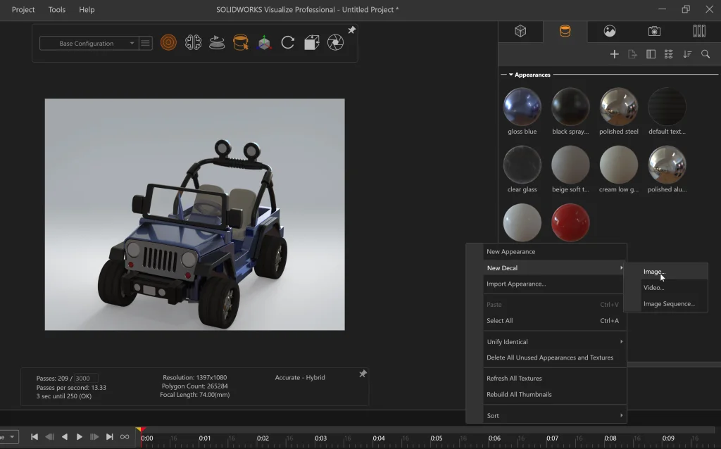 With our SOLIDWORKS Visualize tab activated, we can go ahead and click Export Advanced to jump into Visualize. Applying decals in Visualize is easy – all we need to do is activate the Appearances tab and right-click in the background > New Decal > Image… before selecting the picture we want to use.