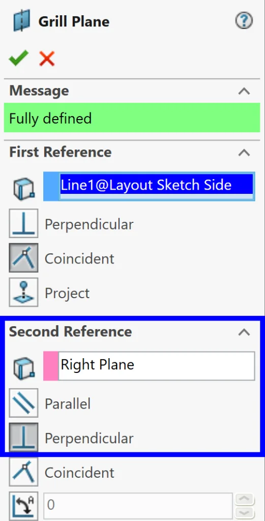 From here, I selected the lines individually and used the shortcut key (S) to select the Plane feature. The first reference is the line and the second reference is a plane – in this case we can select the RIGHT plane and make sure to select the Perpendicular relation.