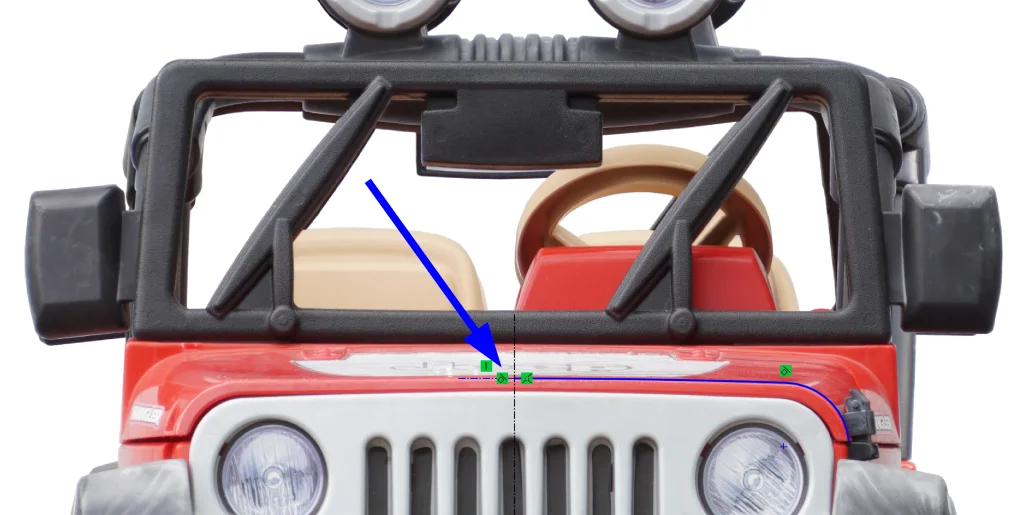 I repeated this for the second plane before switching to a FRONT view and opening a sketch on the plane we just created that is closer to the front (I renamed this to “Grill Plane” in my tree for the sake of organization and sanity). Now we get to trace the front of the hood! Note: it is important here to trace our reference picture in a FRONT view rather than in a view normal to the angled sketch plane that we just created. I tend to personally gravitate towards using lines and arcs here instead of splines, but you could use splines just as easily. Here’s what my trace looks like: