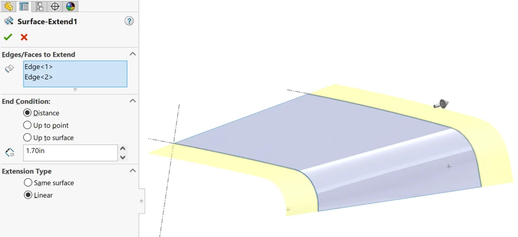 I could have gone back and finished tracing/creating sketches that would have allowed me to do a normal loft, but at this point, I was committed to the technique, so I went back and added a few steps to correct this. First, I rolled back in my tree to right after the surface was created and used Surface Extend to create a larger surface than needed.