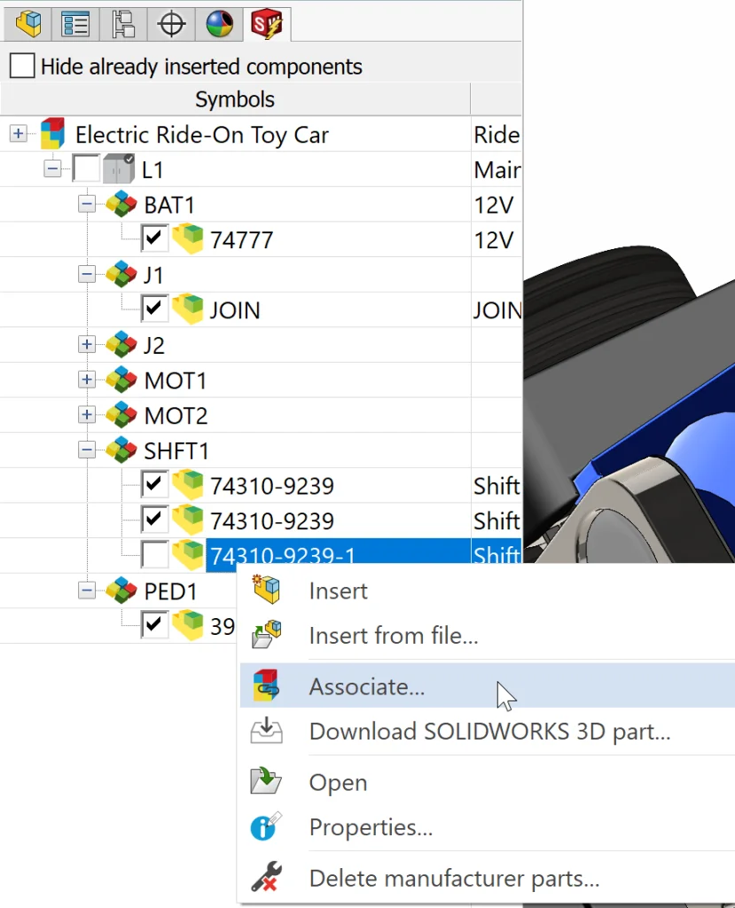 After creating our assembly, we can double-click it in our Document Tree to open it directly in SOLIDWORKS 3D. From here, I decided to insert all of my parts first and then Associate them to my parts in SOLIDWORKS Electrical later. This technique is also incredibly useful if you already have previously-made assemblies that you want to re-use. The only thing we want to remember here is that if we insert a fully completed assembly into our SOLIDWORKS Electrical assembly, we should dissolve it so that the subassemblies and parts are visible in our new tree. In our case, we can just start inserting components from Assembly > Insert Components. Once we have all of our components in place, the next step is super incredibly simple thanks to the power of our purpose-build tool (SOLIDWORKS Electrical 3D). All we need to do is jump over to our SOLIDWORKS Electrical tab and Right-Click on each component > Associate.
