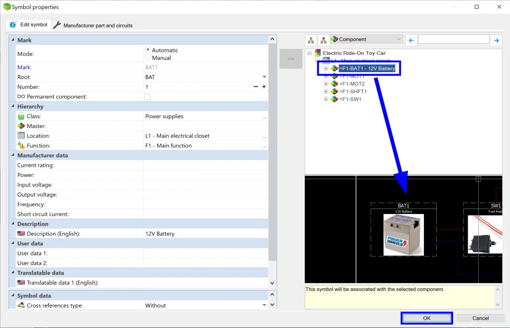 To start off our design, we need a symbol that represents a battery. Since SOLIDWORKS Electrical comes with a ton of pre-loaded standard symbols, we don’t need to create or even modify a symbol here. We can simply go to Schematic > Insert Symbol and select one of our Battery symbols to use out-of-the-box. Once we place our symbol, our properties box automatically pops open. From here, we can quickly Associate our symbol to the component we already created when we made our Line Diagram. Simply click on the correct component in the tree on the right and then click OK.