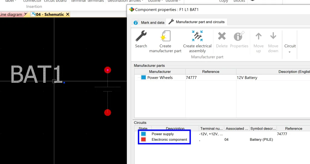 Note: Creating new parts is also easy! The way I decided to do it was from the symbol > double-click > Manufacturer part and circuits > Create manufacturer part.